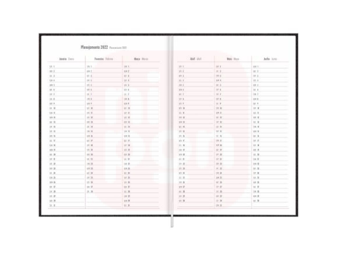Planejamento semanal: folhas com colunas verticais, com linhas para agendamento de horários a cada 30 minutos, com início às 7h e término às 22h. Páginas incluem minicalendário mensal.