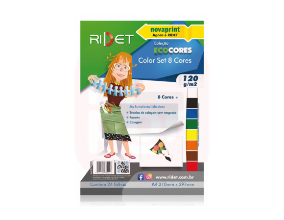 Destaque sua criatividade com o Bloco Ecocores A4 Color Set 120g da Ridet! Composto por 24 folhas em 8 cores vivas e sortidas, este bloco é perfeito para atividades escolares, artesanato, scrapbooking, colagens, painéis e projetos criativos em geral.
