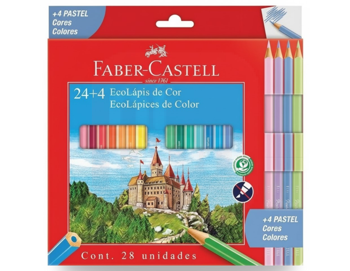 O Lápis de Cor 24 Cores + 4 Cores Pastel Faber-Castell é a escolha perfeita para quem busca variedade, suavidade e um toque de delicadeza nos desenhos. Além das 24 cores vibrantes já conhecidas pela qualidade Faber-Castell, o kit traz 4 tons pastel exclusivos, ideais para composições modernas, criativas e elegantes. Com corpo sextavado, ponta resistente e traço macio, esse conjunto é indicado tanto para uso escolar quanto artístico, oferecendo alta cobertura e conforto ao colorir.