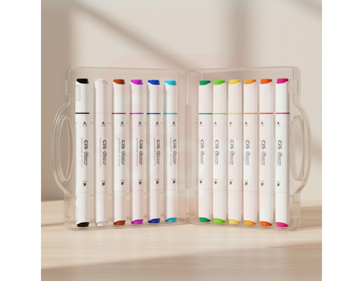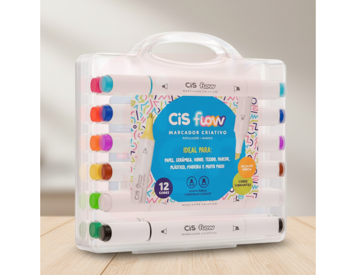 Marcador Criativo CIS Flow 12 Cores – Estojo Maleta - Ponta Dupla